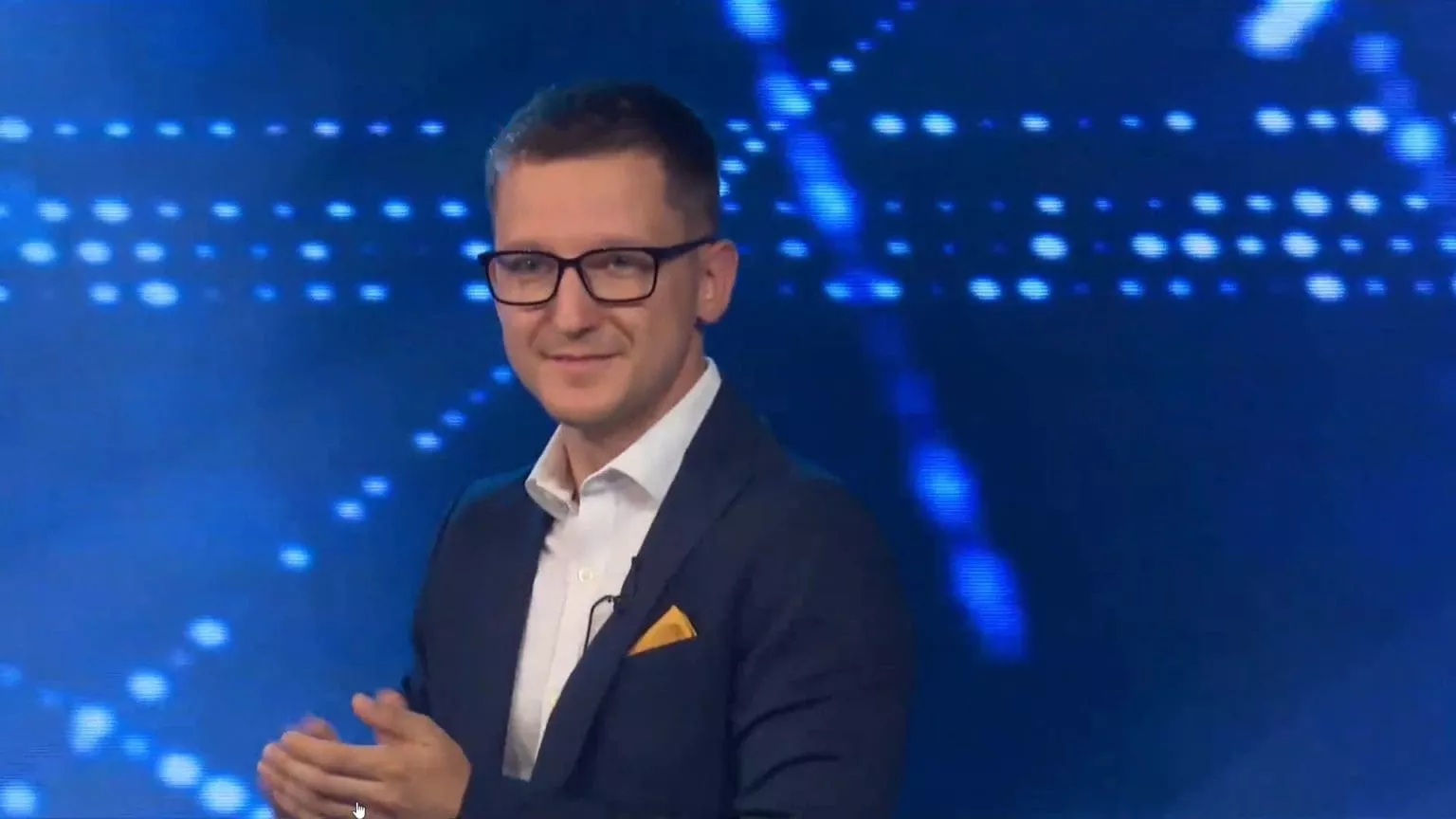 لتمثيل أحدث حدث ل DealShaker ، يقف رجل يرتدي بدلة ونظارات ورئيس جيب أصفر على خشبة المسرح مع أضواء زرقاء في الخلفية.