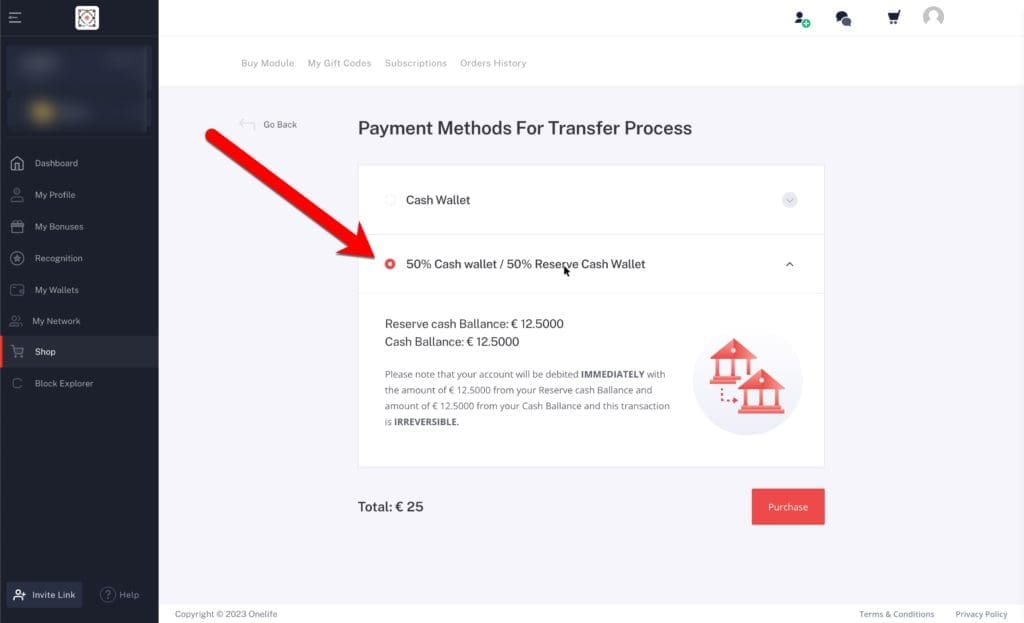 يمكنك استخدام محفظة نقدية أو محفظة احتياطية نقدية كطريقة دفع ، ولكن يمكنك اختيار الدفع نقدا كاملا أو نقدا جزئيا / احتياطيا جزئيا. باختصار ، يمكنك اختيار "النقد الكامل" أو "محفظة نقدية بنسبة 50٪ / محفظة نقدية احتياطية بنسبة 50٪".